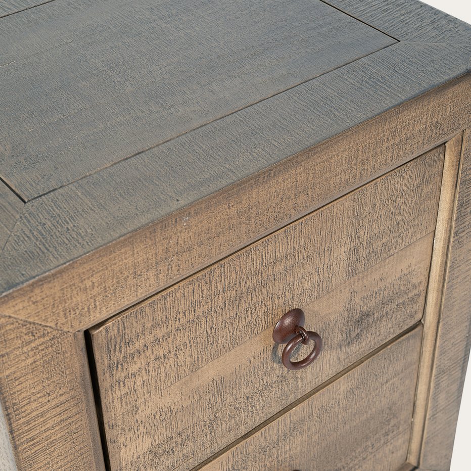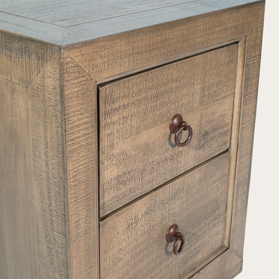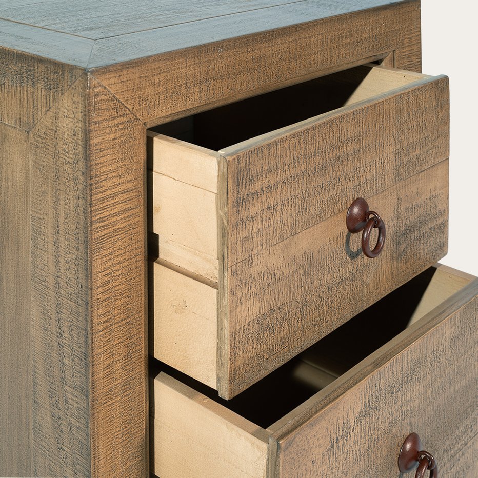 - La mesita de noche Oblak, hecha de madera maciza de araucaria, es una verdadera joya de estilo oriental que nos transporta al pasado. De su diseño de líneas rectas cabe destacar el detalle de sus tiradores metálicos en forma de argolla y su acabado en tono oscuro Nogal. La mesita cuenta con dos cajones idénticos de gran capacidad, que serán perfectos para guardar y mantener en orden todo aquello que necesitemos y no queramos tener a la vista.